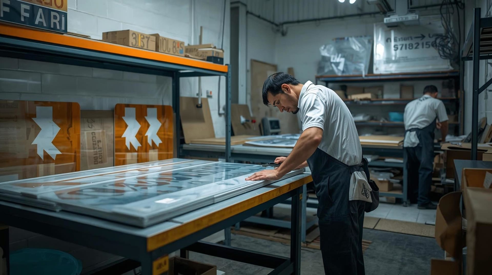 Kunststof platen op maat zagen en voorbereiden voor de afwerking van de wegwijzer borden;